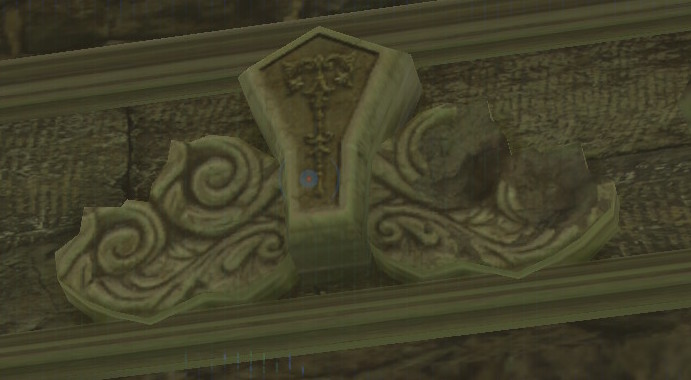 上図はゲーム世界中の、とある遺跡の壁に刻まれた紋章である。ゲーム中に詳しい説明はないものの、なにがしかの由緒を感じさせるデザインである。右側の葉のような部位が欠けているのは、そういうデザイン、ということではなく、風化の為であろうと想像できる。