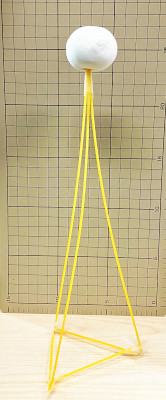 ところが、これを自立させるまでが大変だった。そもそもスパゲティどうしを繋ぎ止めるのが大変だったのは上に書いた通りだが、その手段が一通り確立した後も困難の連続だった。作ってみて分かったのだが、上図のような構造でマシュマロを載せたまま塔を自立させようとすると、かなりの工作精度が要求される。底面となる三角形から重心がはみ出すと塔は倒れてしまうので、上へ延びる3辺の長さを等しくしないといけないのだが、テープで3本のスパゲティを止めつつ、長さが揃うように作り上げるのは簡単なことではない。その上、すべてのスパゲティが同じようにしなってくれないと、かんたんにマシュマロが重心を外れるのだ。