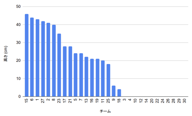 これだけ読むと、簡単なことのように思えるかもしれない。しかし、実際に学生にやらせてみたときの結果を下のグラフに示すが、この年は全30チームのうち12チームが、塔にマシュマロを載せたときに倒れてしまった。高さ 10cm に満たなかった2チームは、倒壊後に大慌てで小さな塔を作り、かろうじて 0cm を免れたものである。つまり、半数近くのチームで、スパゲティの塔は倒壊したのだ。
