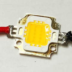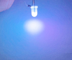 実物で確認してみよう。下図1枚目は「パワー LED」と呼ばれる、照明用途で使われる白色 LED で、黄色く見える部分に蛍光体が含まれている。これに青色 LED の光を近付けると、蛍光体からの光と混ざりあって全体が白く光るのを確認することができる(下図2枚目)。
